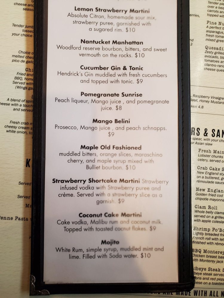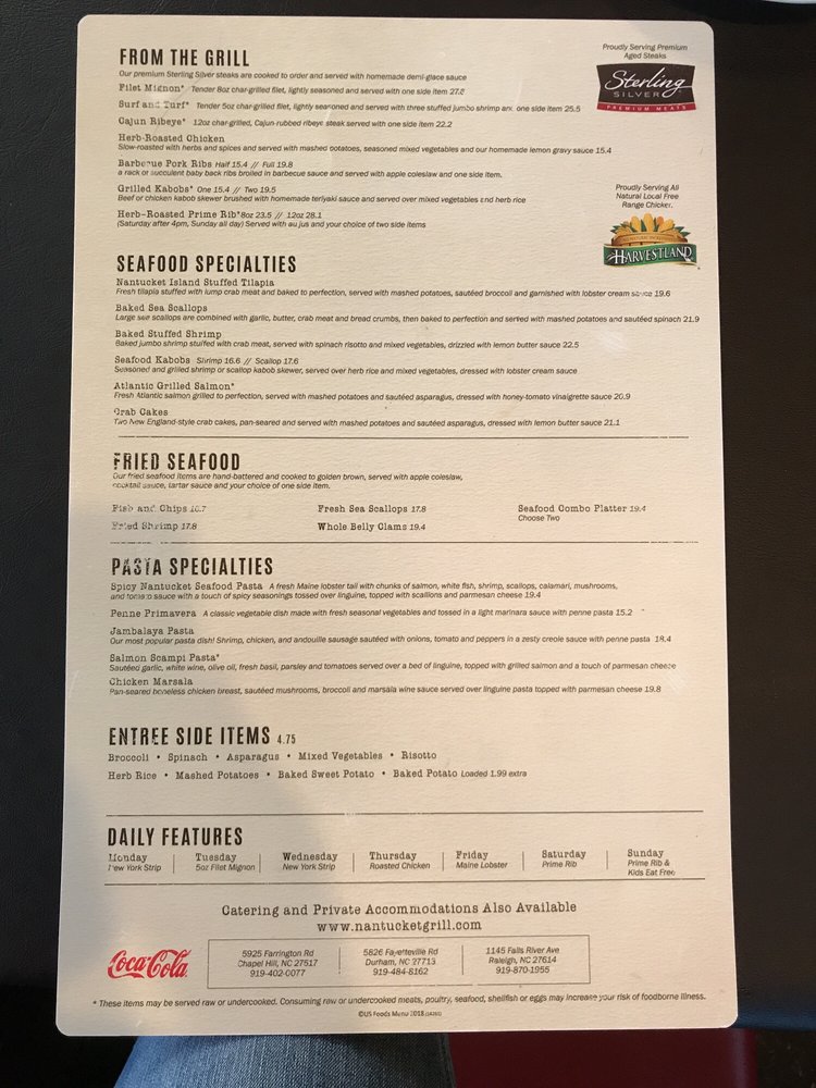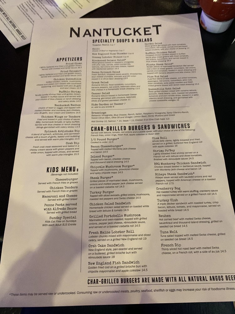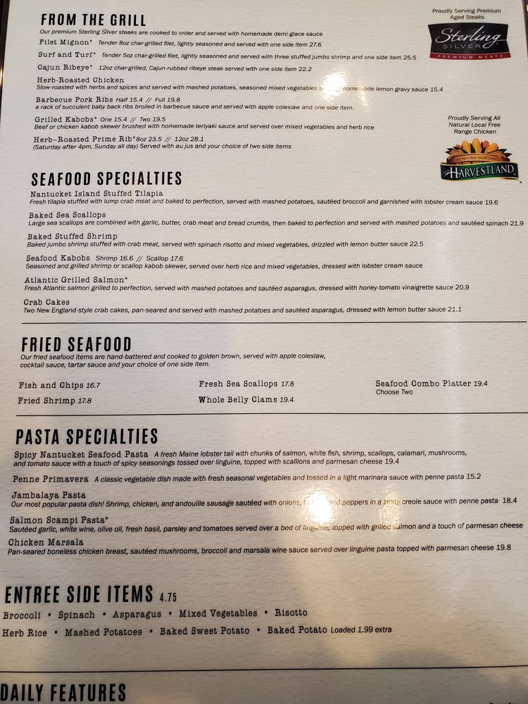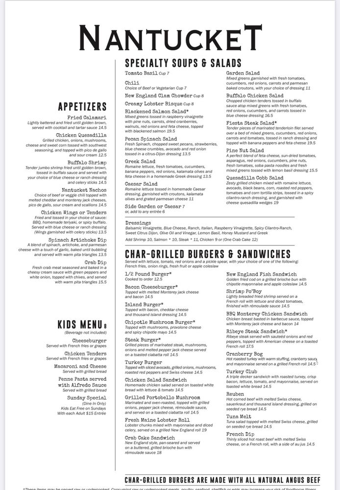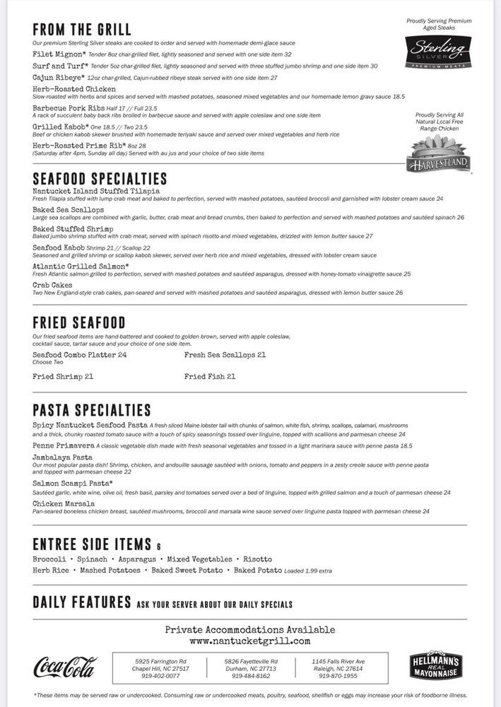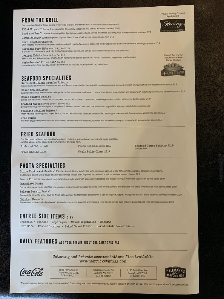 Nantucket Grill - Durham offers a wide array of appetizers, soups, and main dishes in a casual setting. The menu includes options like Fried Clams, Fried Calamari, Chicken Quesadilla, Buffalo Shrimp, Nantucket Nachos, Chicken Wings, and more. Customers rave about the delicious food, with standout dishes like the Crab Dip and Baked Stuffed Shrimp. The atmosphere is family-friendly, and the service is top-notch. The restaurant also offers a full bar with a decent beer selection. If you're a seafood lover, this is the place for you. Don't forget to save room for their famous cakes, which are a must-try! Nantucket Grill - Durham is a reliable option for a satisfying meal and a pleasant dining experience.